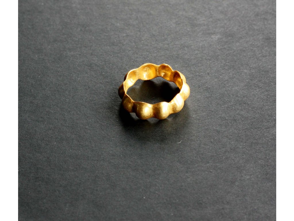 Prsten je ručně vytepávaný, jeho povrch je jemně kartáčovaný, solidně pozlacený a navíc krytý vrstvičkou tvrdého průhledného laku proti otěru.